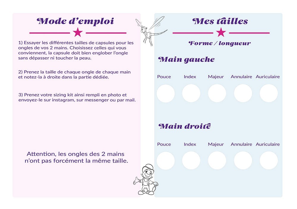 Le sizing kit est un document qui vous sera envoyé vous permettant de prendre les mesures de vos ongles et de les reporter au verso.